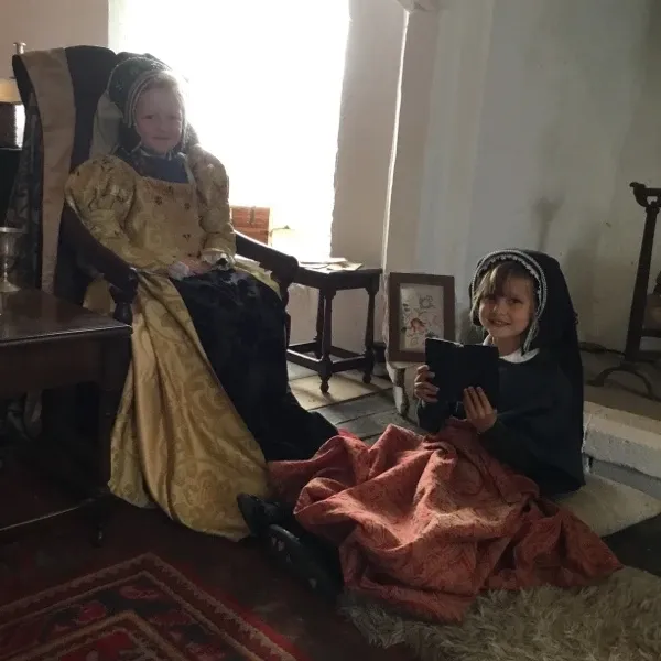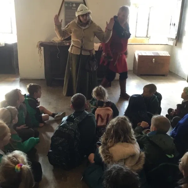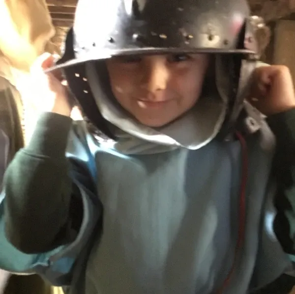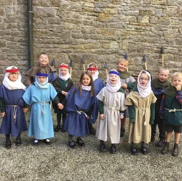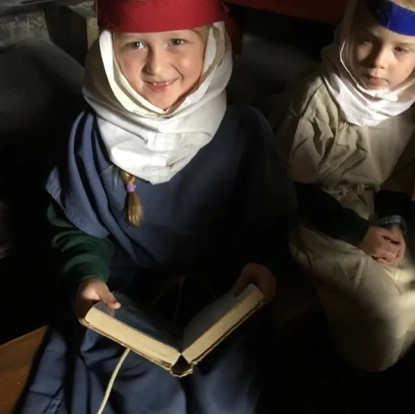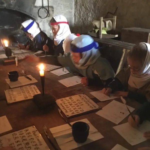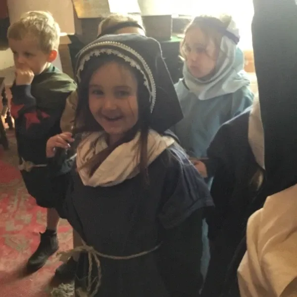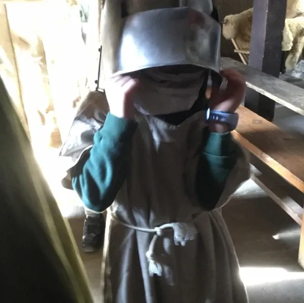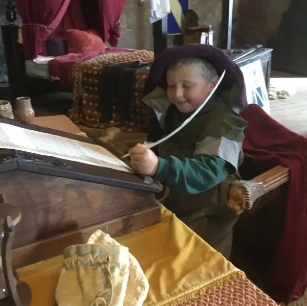 We started the day by meeting Master David and his wife Sue who talked to us about the castle and showed us the entrance called the Portcullis. After that we went into the solar to get dressed for the day. Once ready, we looked at lots of artefacts from the castle and talked about castle life, we were allowed to try these on. After that, we went to learn about what schooling was like in the castle. We had to use a quill and ink to write our names, it was hard. Each of us had a photo in different roles in the castle, we are going to make a book over the next few weeks.